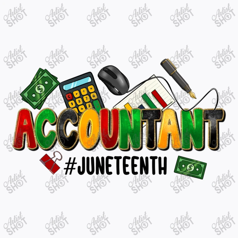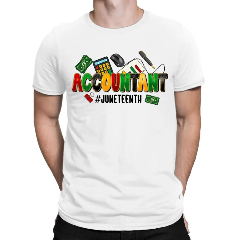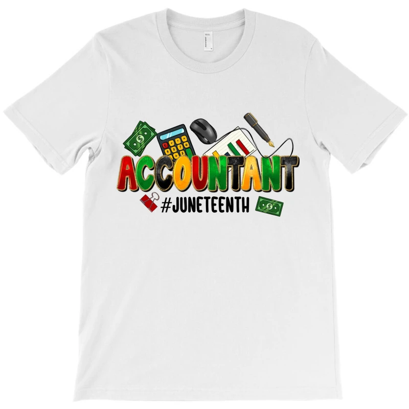 Digital printing is an amazing process that involves your artwork “Accountant Juneteenth” being processed by a computer and then printed directly onto the surface of your product. Digital printing is not a heat transfer or applique, as the ink directly adheres to the fabric of your shirt. Each printing process has its strengths, and our artwork team will weigh these when deciding which to use for your art.