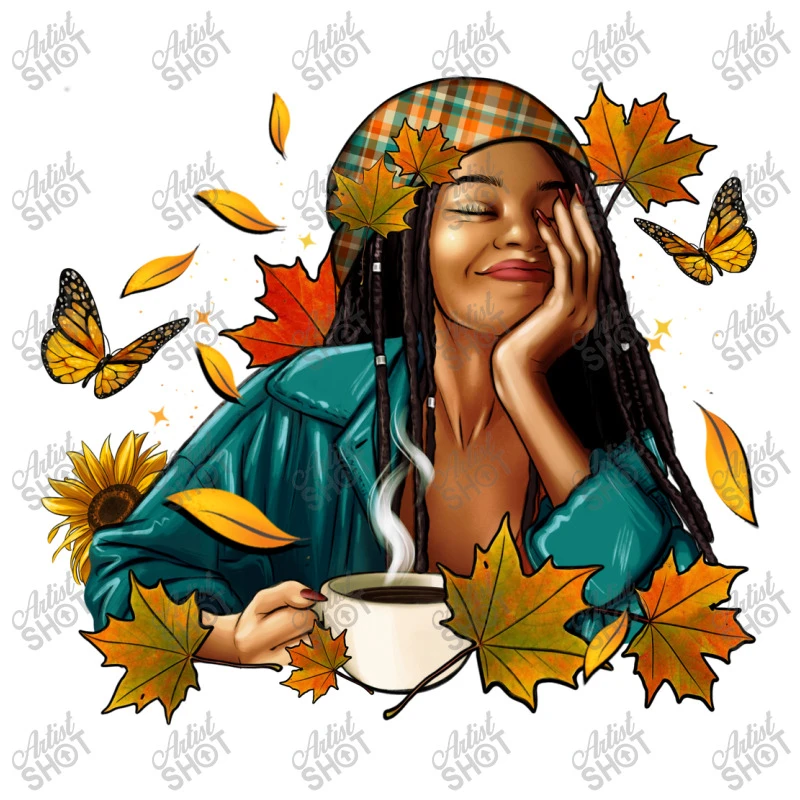 Digital printing is an amazing process that involves your artwork “Fall Afro Woman With Coffee” being processed by a computer and then printed directly onto the surface of your product. Digital printing is not a heat transfer or applique, as the ink directly adheres to the fabric of your shirt. Each printing process has its strengths, and our artwork team will weigh these when deciding which to use for your art.