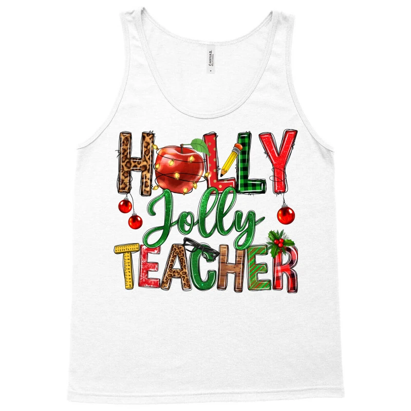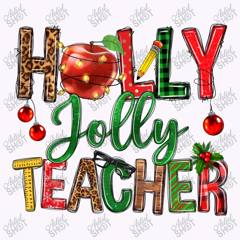 Digital printing is an amazing process that involves your artwork “Holly Jolly Teacher” being processed by a computer and then printed directly onto the surface of your product. Digital printing is not a heat transfer or applique, as the ink directly adheres to the fabric of your shirt. Each printing process has its strengths, and our artwork team will weigh these when deciding which to use for your art.