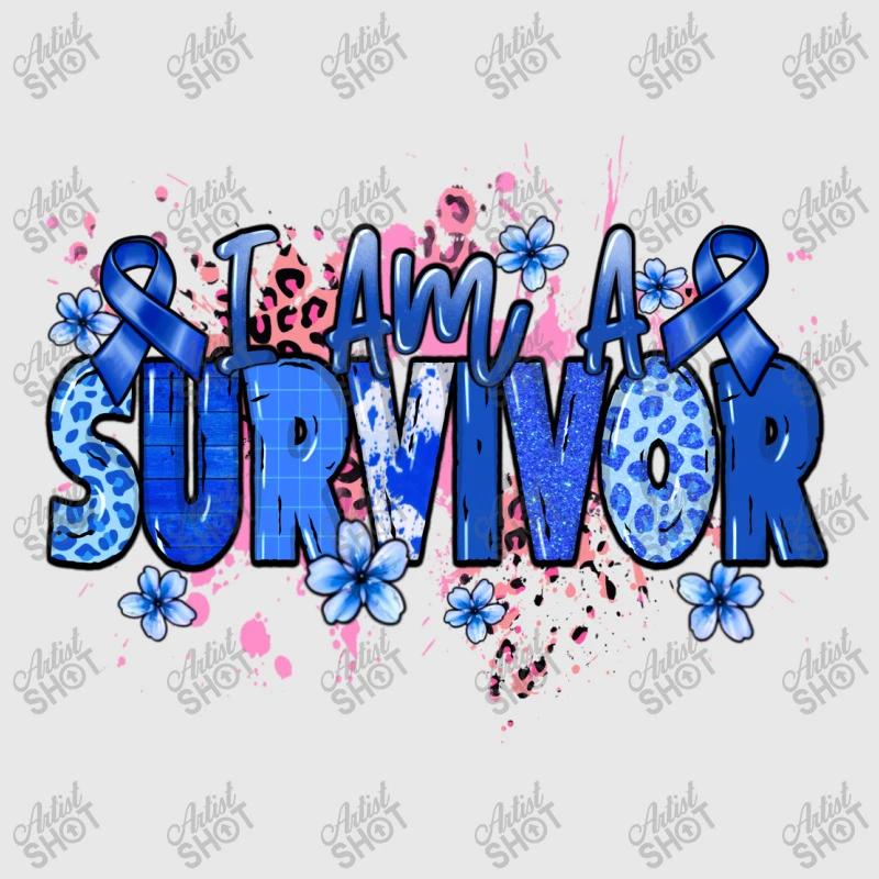 Digital printing is an amazing process that involves your artwork “I Am A Survivor Colon Cancer Blue Ribbon” being processed by a computer and then printed directly onto the surface of your product. Digital printing is not a heat transfer or applique, as the ink directly adheres to the fabric of your shirt. Each printing process has its strengths, and our artwork team will weigh these when deciding which to use for your art.