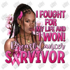 Digital printing is an amazing process that involves your artwork “I Fought For My Life And I Won Afro Woman” being processed by a computer and then printed directly onto the surface of your product. Digital printing is not a heat transfer or applique, as the ink directly adheres to the fabric of your shirt. Each printing process has its strengths, and our artwork team will weigh these when deciding which to use for your art.