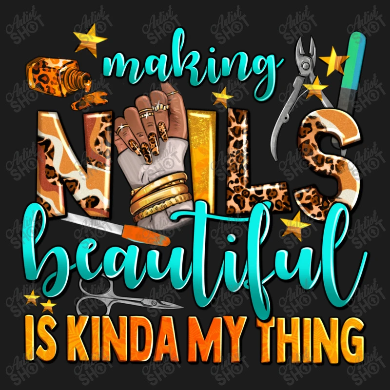 Digital printing is an amazing process that involves your artwork “Making Nails Beautiful Is Kinda My Thing” being processed by a computer and then printed directly onto the surface of your product. Digital printing is not a heat transfer or applique, as the ink directly adheres to the fabric of your shirt. Each printing process has its strengths, and our artwork team will weigh these when deciding which to use for your art.