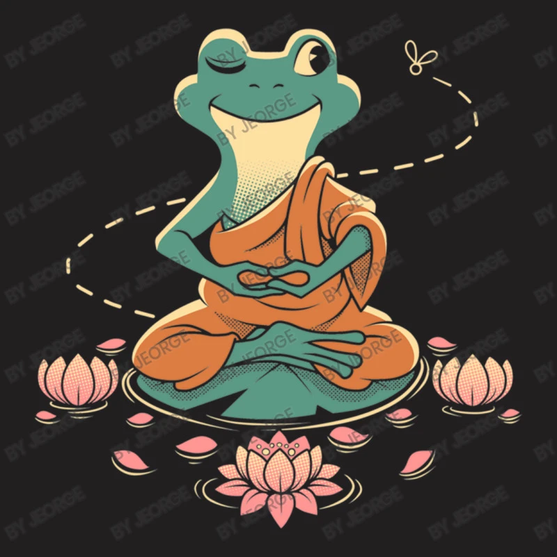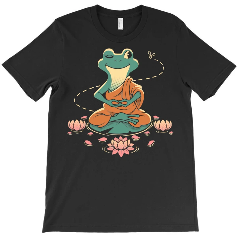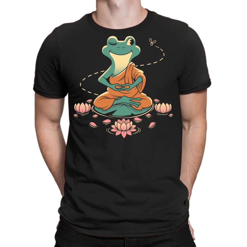 Digital printing is an amazing process that involves your artwork “Meditation Frog” being processed by a computer and then printed directly onto the surface of your product. Digital printing is not a heat transfer or applique, as the ink directly adheres to the fabric of your shirt. Each printing process has its strengths, and our artwork team will weigh these when deciding which to use for your art.