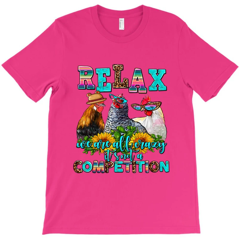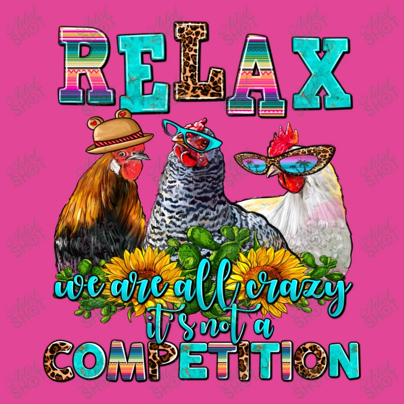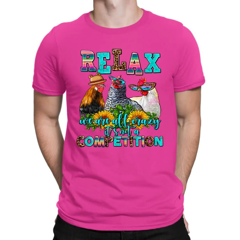 Digital printing is an amazing process that involves your artwork “Relax We Are All Crazy Competition” being processed by a computer and then printed directly onto the surface of your product. Digital printing is not a heat transfer or applique, as the ink directly adheres to the fabric of your shirt. Each printing process has its strengths, and our artwork team will weigh these when deciding which to use for your art.