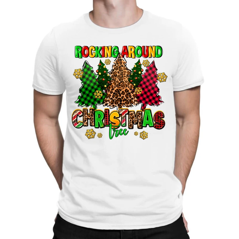 Digital printing is an amazing process that involves your artwork “Rocking Around The Christmas Tree” being processed by a computer and then printed directly onto the surface of your product. Digital printing is not a heat transfer or applique, as the ink directly adheres to the fabric of your shirt. Each printing process has its strengths, and our artwork team will weigh these when deciding which to use for your art.