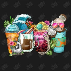 Plot Printing Consists of both Flock and Flex Print, This process transfers your artwork “Skeleton Summer Coffee Cups” from a special foil through an immense amount of pressure and heat. Flex images are smooth, a little plastic like and a tad bit glossy. Flock images have a fuzzy velvet-like texture and appear slightly more elevated. Think of drawing just the shadows and how that would appear without color. 3 colors plus the color of the garment itself is used to print.