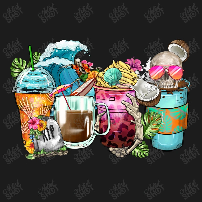 Digital printing is an amazing process that involves your artwork “Skeleton Summer Coffee Cups” being processed by a computer and then printed directly onto the surface of your product. Digital printing is not a heat transfer or applique, as the ink directly adheres to the fabric of your shirt. Each printing process has its strengths, and our artwork team will weigh these when deciding which to use for your art.