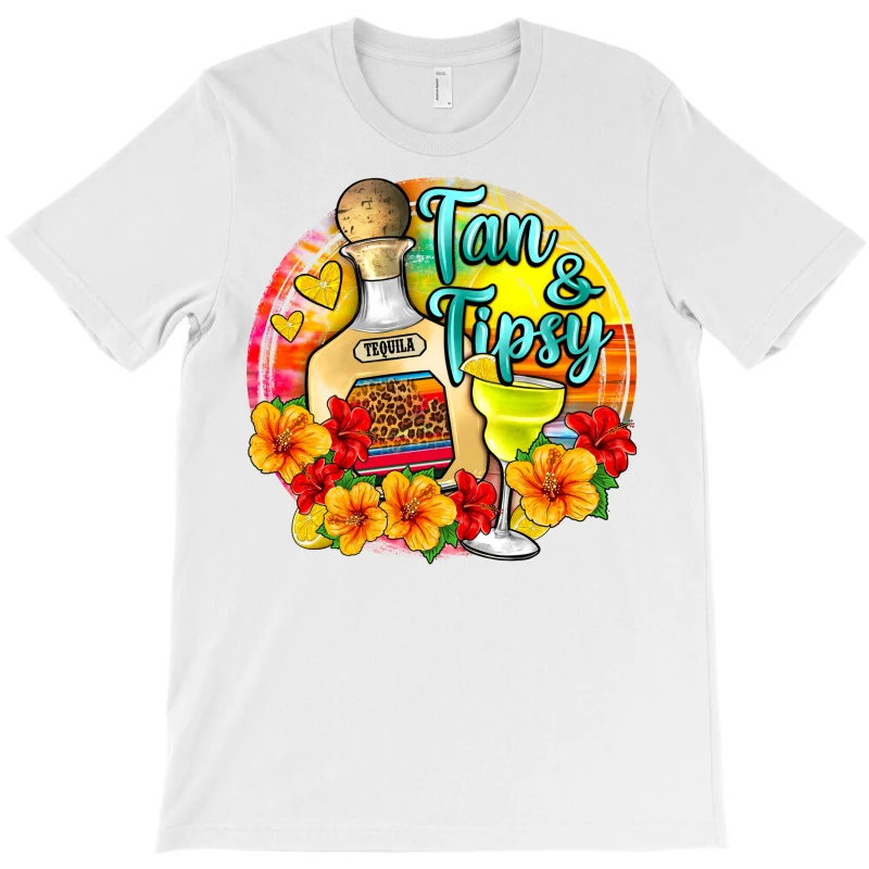 Digital printing is an amazing process that involves your artwork “Tan And Tipsy” being processed by a computer and then printed directly onto the surface of your product. Digital printing is not a heat transfer or applique, as the ink directly adheres to the fabric of your shirt. Each printing process has its strengths, and our artwork team will weigh these when deciding which to use for your art.