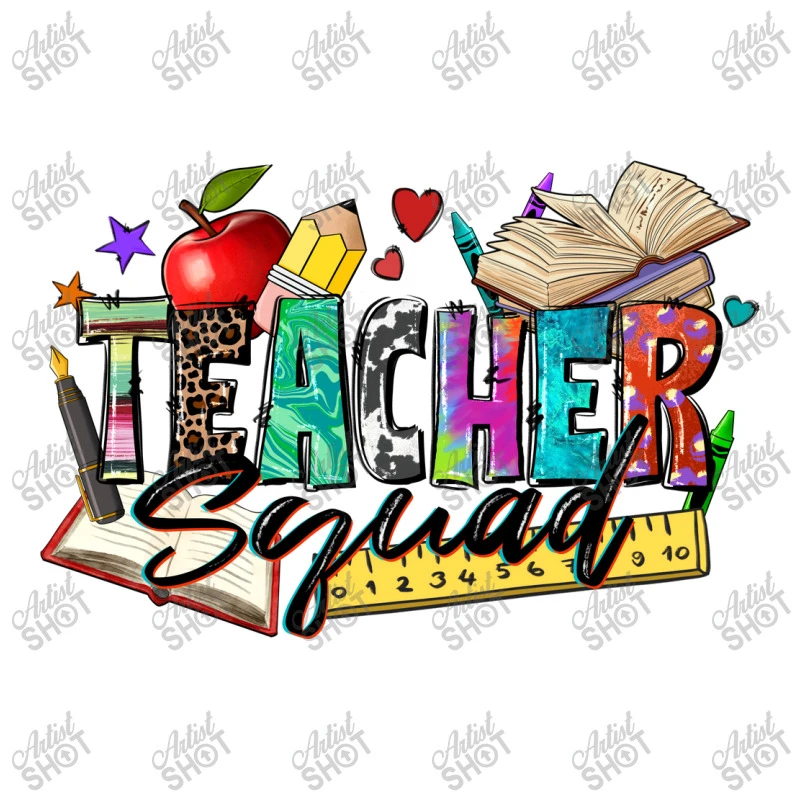 Digital printing is an amazing process that involves your artwork “Teacher Squad” being processed by a computer and then printed directly onto the surface of your product. Digital printing is not a heat transfer or applique, as the ink directly adheres to the fabric of your shirt. Each printing process has its strengths, and our artwork team will weigh these when deciding which to use for your art.