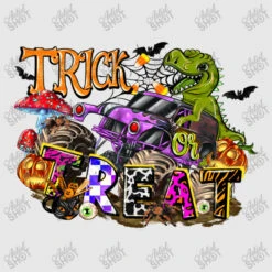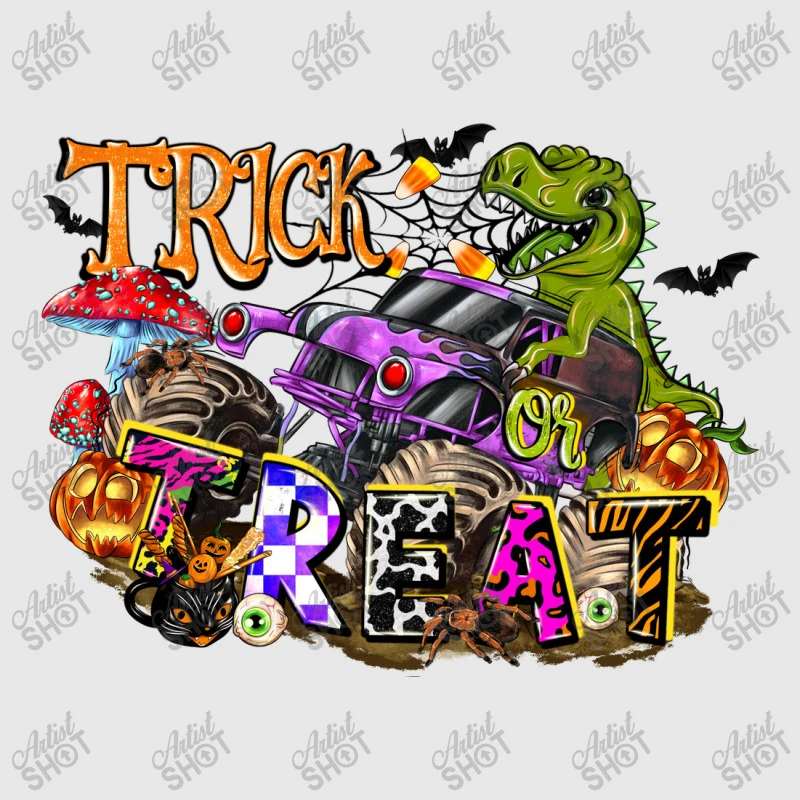 Plot Printing Consists of both Flock and Flex Print, This process transfers your artwork “Trick Rawr Treat” from a special foil through an immense amount of pressure and heat. Flex images are smooth, a little plastic like and a tad bit glossy. Flock images have a fuzzy velvet-like texture and appear slightly more elevated. Think of drawing just the shadows and how that would appear without color. 3 colors plus the color of the garment itself is used to print.