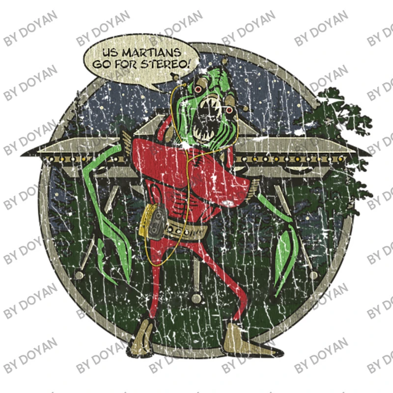 Digital printing is an amazing process that involves your artwork “Us Martians Go For Stereo 1980” being processed by a computer and then printed directly onto the surface of your product. Digital printing is not a heat transfer or applique, as the ink directly adheres to the fabric of your shirt. Each printing process has its strengths, and our artwork team will weigh these when deciding which to use for your art.