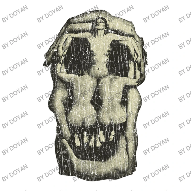 Plot Printing Consists of both Flock and Flex Print, This process transfers your artwork “Voluptuous Death 1951” from a special foil through an immense amount of pressure and heat. Flex images are smooth, a little plastic like and a tad bit glossy. Flock images have a fuzzy velvet-like texture and appear slightly more elevated. Think of drawing just the shadows and how that would appear without color. 3 colors plus the color of the garment itself is used to print.
